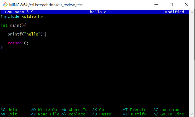 나노 편집기를 사용하여 hello.c 파일을 만들어 주었다.