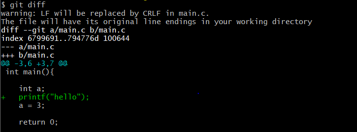 이 상태에서 commit 전과 후의 수정된 내용을 볼 수 있는 명령어가 git diff이다.