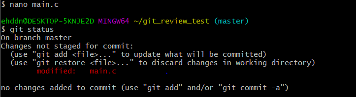 git status를 해보면 main.c가 다시 commit 되지 않은 상태가 되어있다.