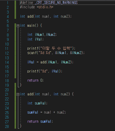 위 코드에서 4행이 함수의 선언, 14행이 함수의 호출, 21~28행이 함수의 정의 부분이다.