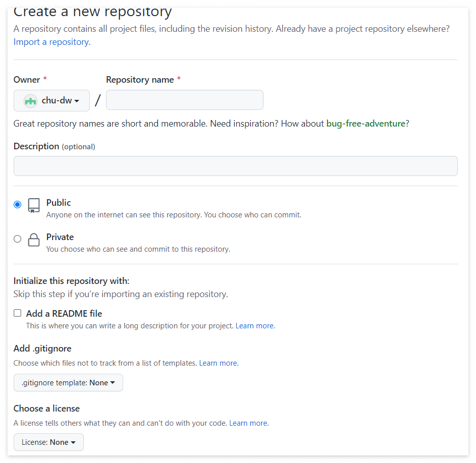 public은 다른사람이 내 레파지토리를 볼 수 있게 설정하는 것이고 private는 혼자만 보는 것이다.