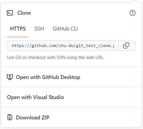위와 같은 화면이 뜨고 초록색 code 부분을 누르면 원격저장소의 주소가 나온다.