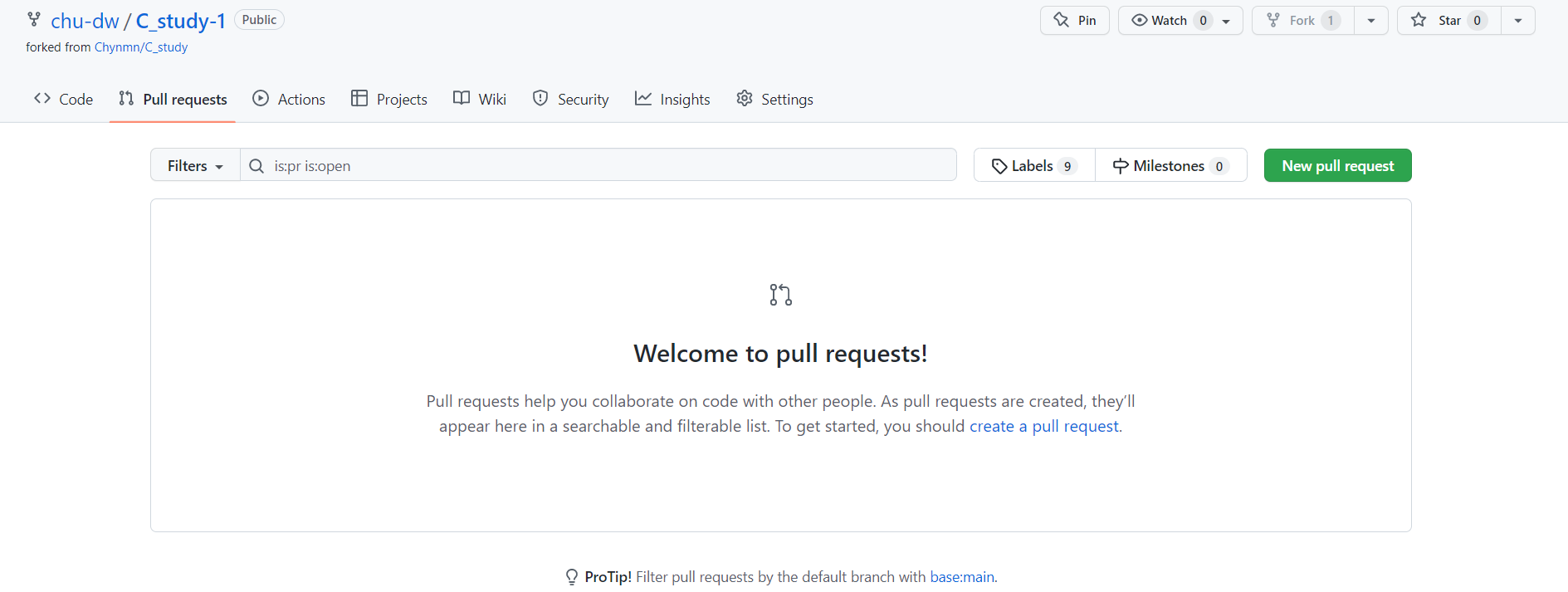 하는 방법은 수정한 내 레파지토리 메뉴에서 pull requests에 들어가서 new pull request 를 누르면 된다.