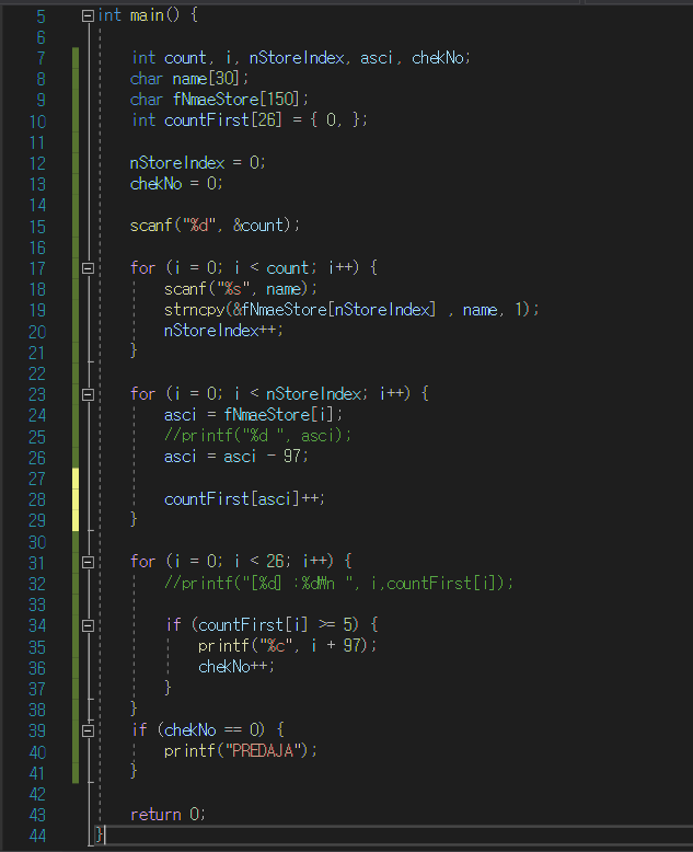 문제는 문자열을 여러 개 입력받아 입력받은 문자열 첫 글자가 같은 알파벳이 5개 이상 일 경우