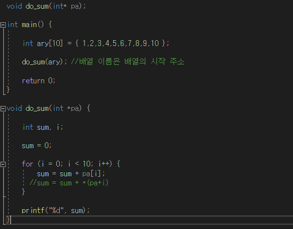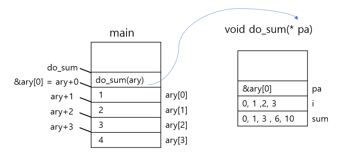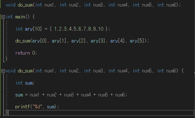 main의 배열에 10개의 수가 저장되어있고 이 수들을 더해주는 함수를 만든다 생각해보자.