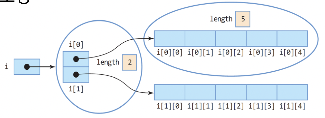 즉 i[0]이 0번쨰 행을 가르키는 레퍼런스 변수이므로 i[0] = new int[3]을 해주면 0번쨰 행은 3개의 값을 가지게 된다.