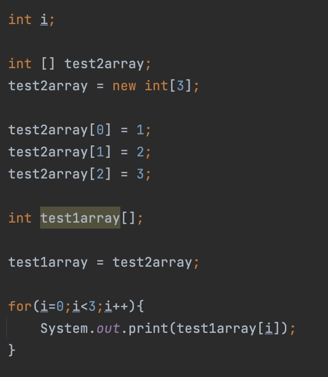 위 코드를 보면 test2array라는 레퍼런스 변수가 선언된 후 배열이 생성되었다.