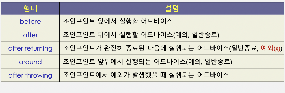 - Advice : 조인 포인트에 삽입되어 실행되는 코드