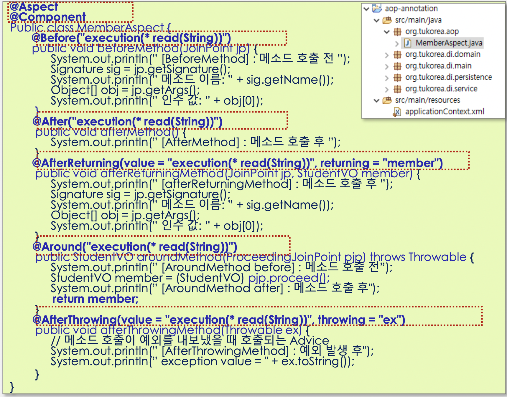 - Aspect 클래스에서 애노테이션 이용해 포인트컷, 어드바이스를 설정 해준다.