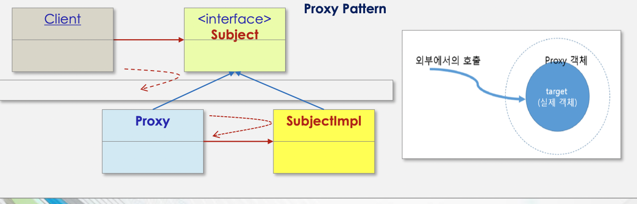 - 객체를 직접적으로 참조하는 것이 아닌, 객체를 대행하는 프록시 객체를 통해 대상에 접근