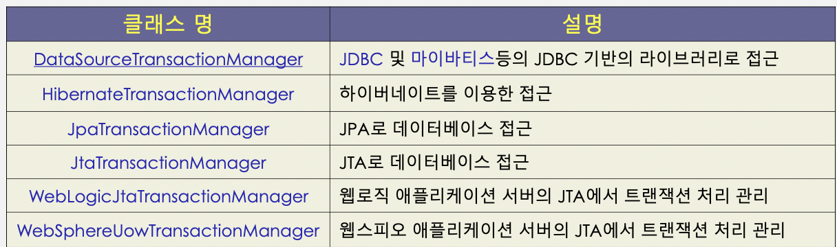 - 대표적인 트랜잭션 구현 클래스 : 트랜잭션 시작,종료,롤백 등 정의 정보를 설정