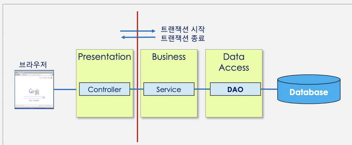 - 프리젠테이션 층에 공개된 서비스의 메서드가 트랜잭션 시작과 종료