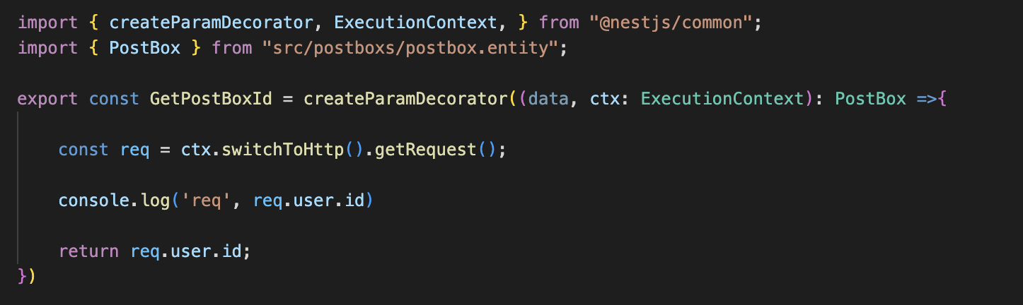 nestjs에선 데코레이터는 함수 형태로 작성되며 @nestjs/common의 createParamDecorator함수를 사용해 정의한다. (고 공식문서에 나와있다.)