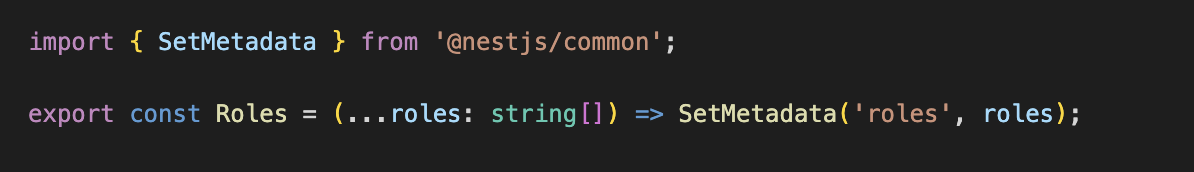 NestJs는 메타데이터를 설정하는 SetMetadata 함수를 정의하고 있고 아래처럼 사용한다.