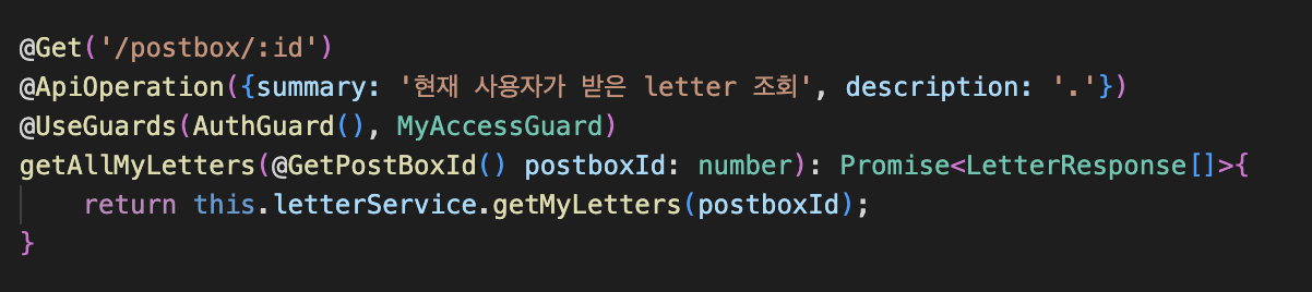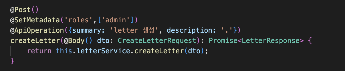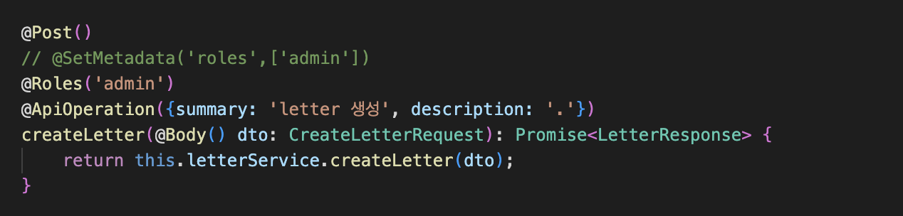 이렇게 해주면 createLetter는 admin이라는 role을 가진 메타 데이터를 가지게 된다.