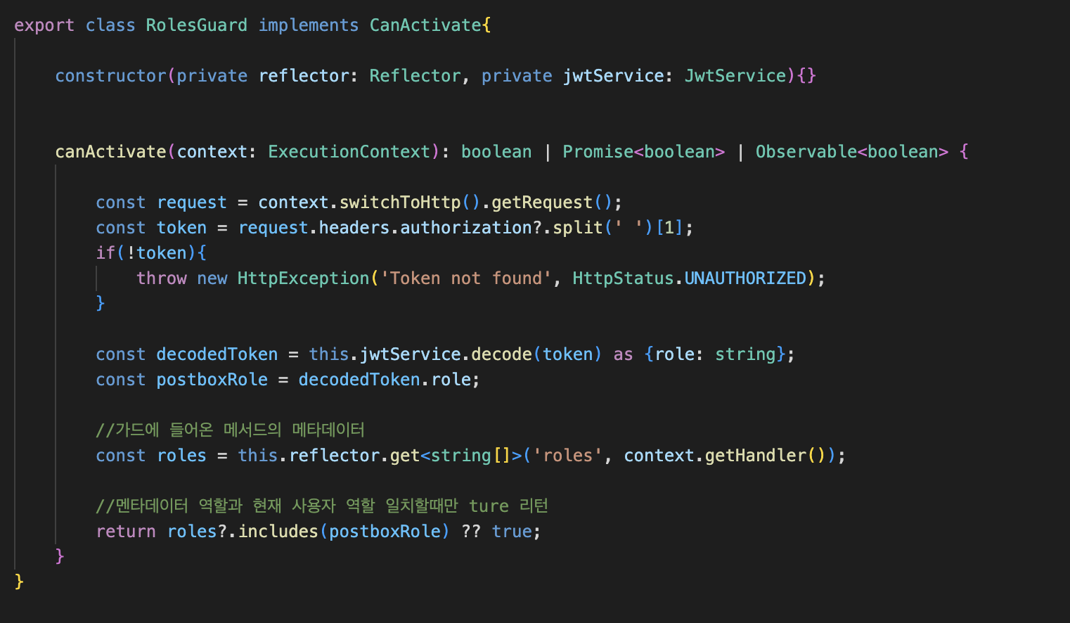 그럼 role을 검증하는 guard를 만들어 메타데이터를 적용 해보겠다. guard에 Reflector를 주입하여 사용한다.