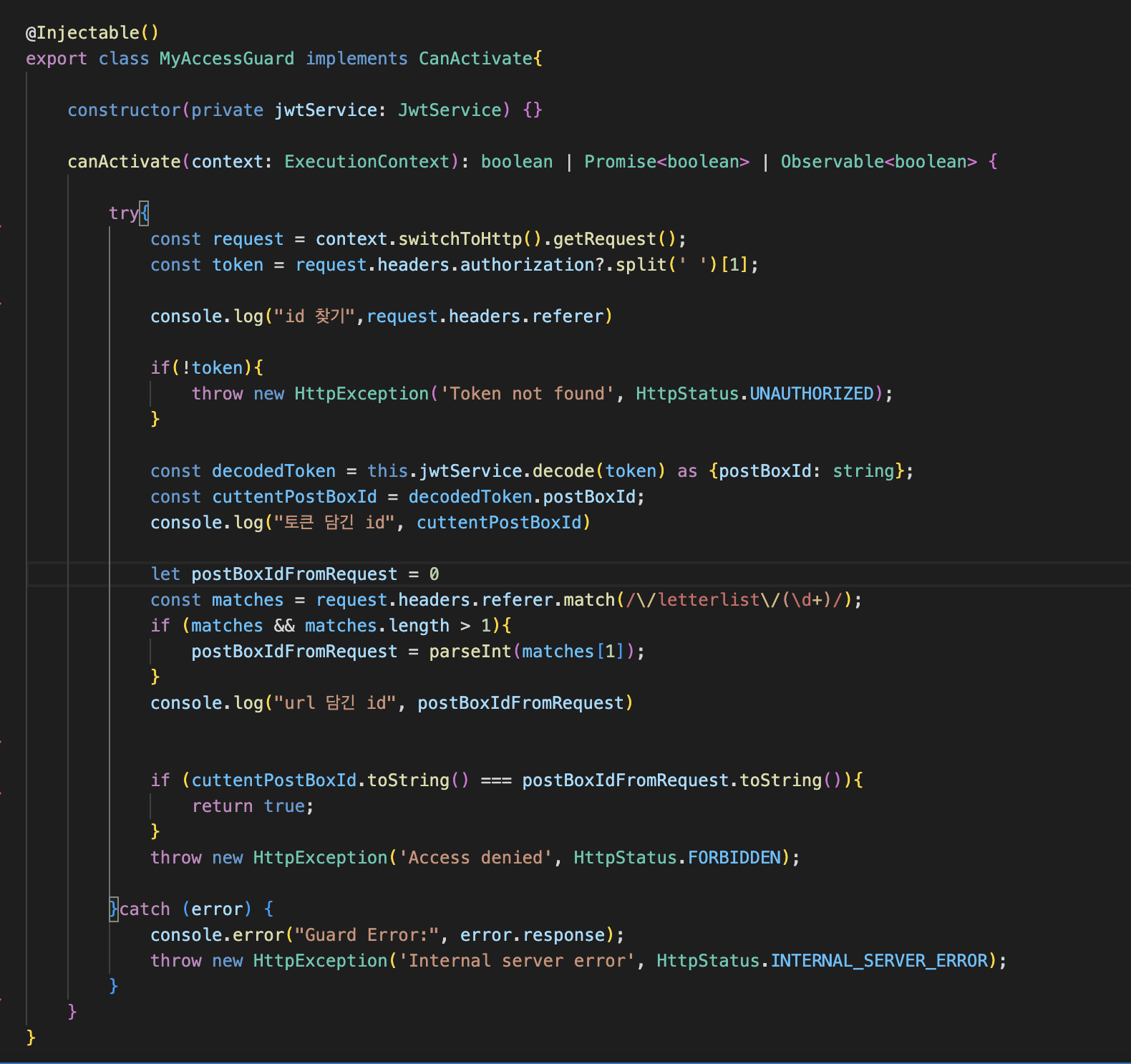그럼 프로젝트에서 구현 했던 guard를 다시보면 해당 guard의 경우 passport를 사용하지 않고 구현 하였다.