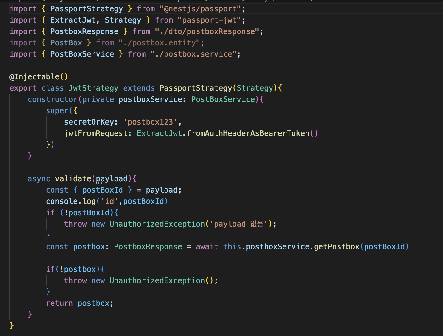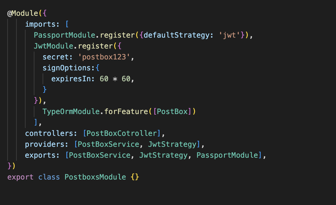 현재 프로젝트에서 passport와 jwt모듈이 postbox(user역할) 모듈에서 import되고 있었는데